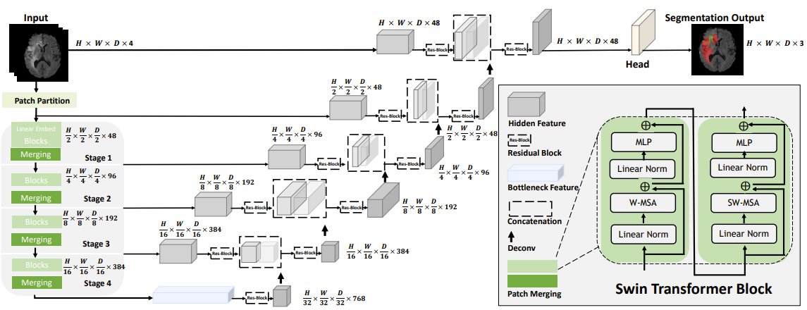 기존 UNETR(Transformer + UNet)의 구조에서 Swin-Transformer를 이용한 모델입니다!