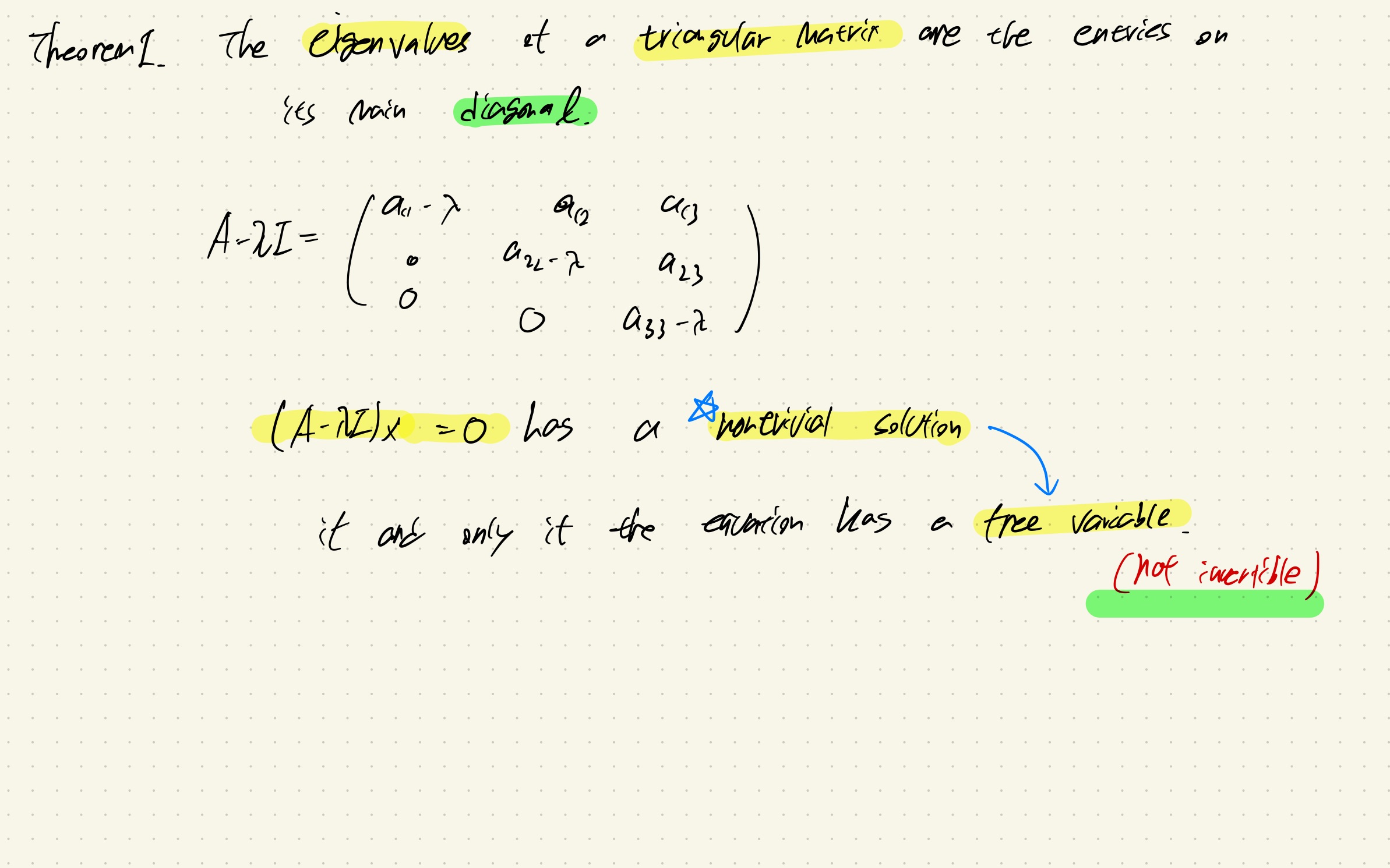 Triangular matrix의 경우, diagonal term이 eigenvalues이다.