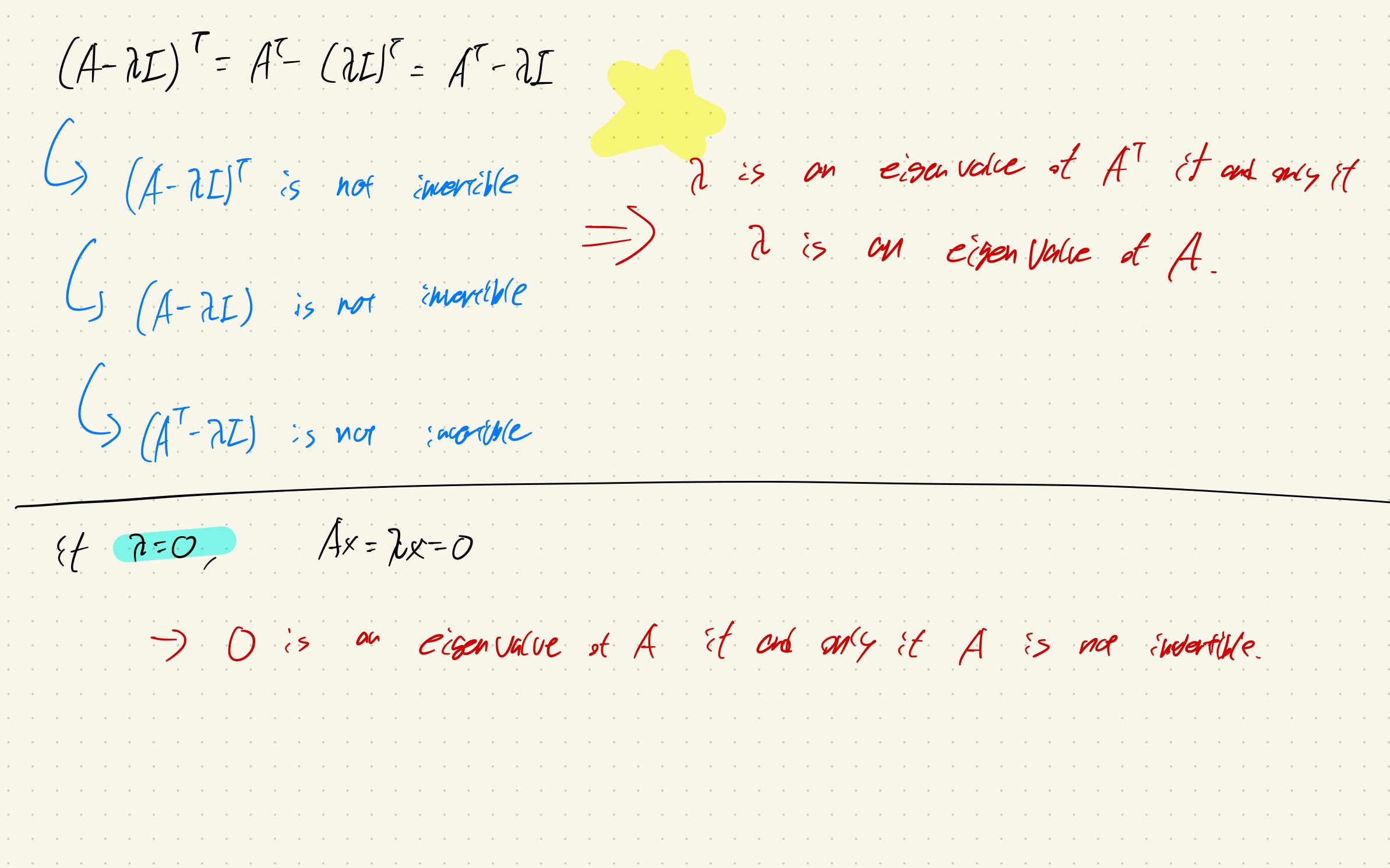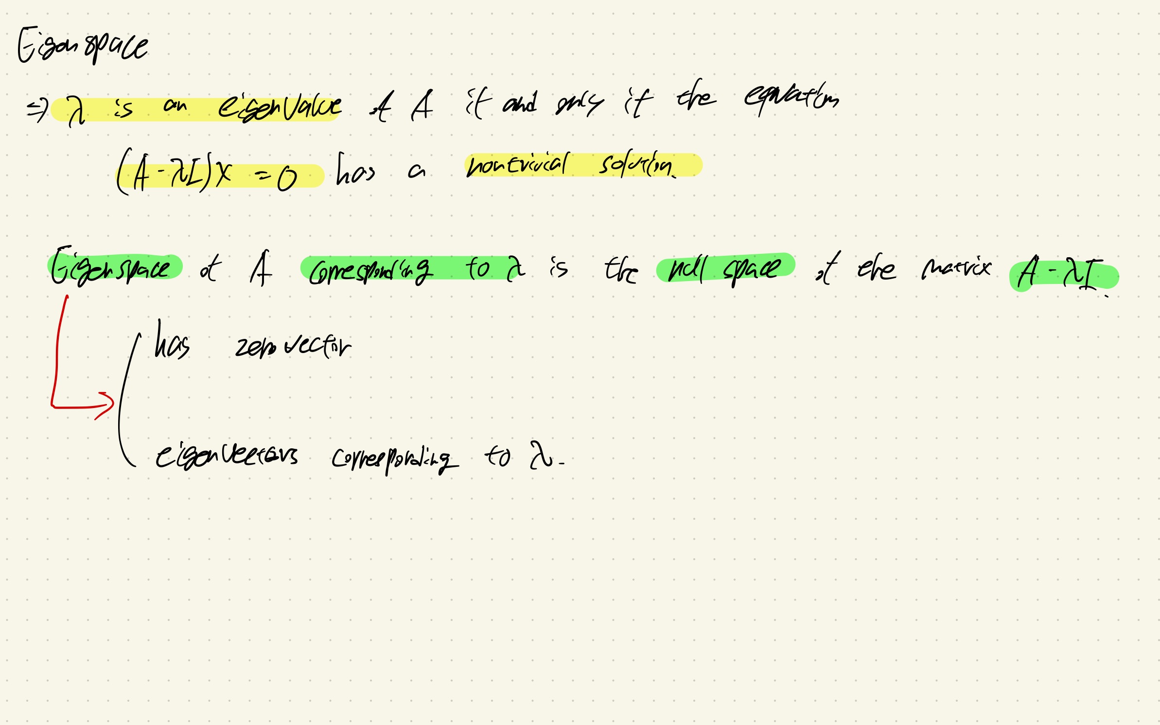 Eigenspace는 zero vector를 포함하고 있는 것이다.