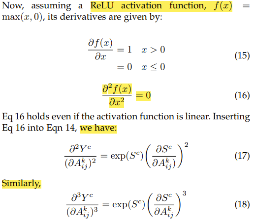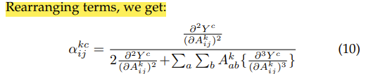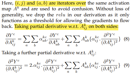 4. (7) equation에 대해서 특정한 k번째 activation map A에서 (i,j)에 대한 미분식을 구하면 (8) equation이 되고, 2계도 미분 함수는 (9) equation이 된다.