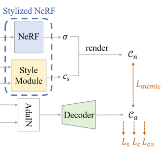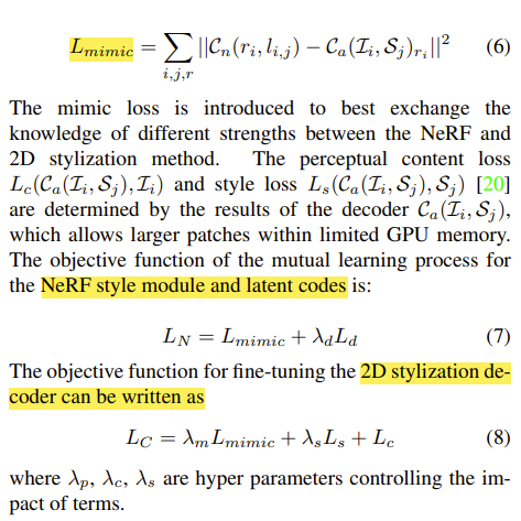 여기에서는 2D stylization(Decoder output)에서 나오는 style image와 Stylized NeRF를 통해서 나오는 style image간의 L2 loss function를 이용한 Lmimic을 이용한다.