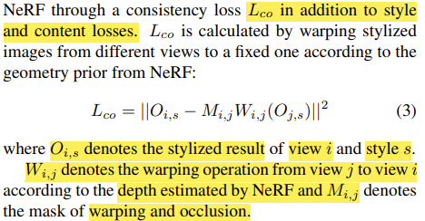해당 loss function은 style loss와 content loss의 특징을 모두 담은 것이고, NeRF에서 나온 depth값도 적절히 이용한다.