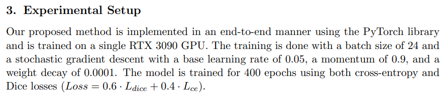 - 단일 RTX 3090 GPU와, batch size 24, SGD(lr=0.05), weight decay=0.0001, 400 epoch, cross-entropy+Dice losses를 이용하였다.