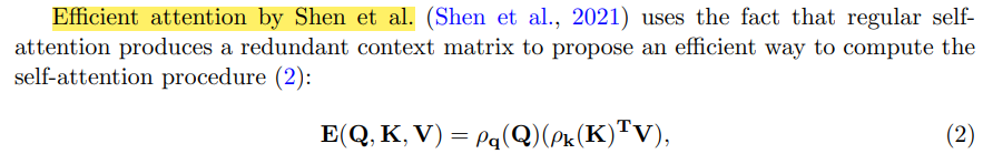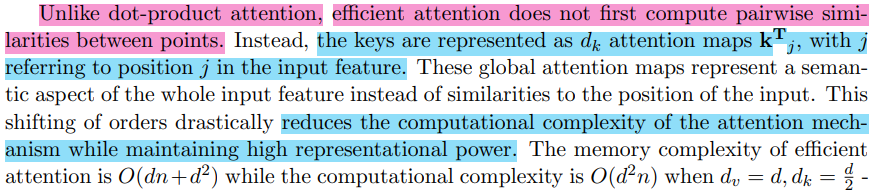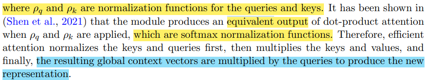 +) Efficient Attention의 구조는 dot-product attention(softmax normalization)과 동등한 output을 낸다고 논문에서 소개하고 있다. (output 값이 같다는 의미보다는, global context vector를 new representation vector로 표현한다는 의미.)