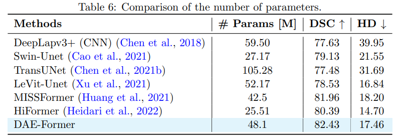 DAE-Former는 Transformer 기반이지만, 좀 더 효율적인 방식으로 모델의 구조를 구성하여 상대적으로 적은 memory로 높은 성능을 이끌어내는 모델이다.