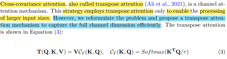 Transpose Attention은 Key, Query간의 교차 공분산(Cross-covariance)를 기반으로 하는 attention이라고 생각하면 편할 수도 있다.