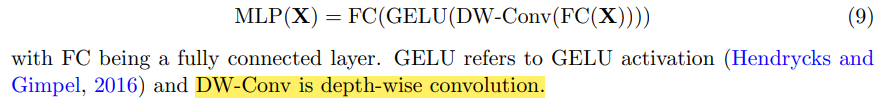 +) MLP의 구조로, depth-wise convolution과 GELU, FC-layer를 활용하였다.