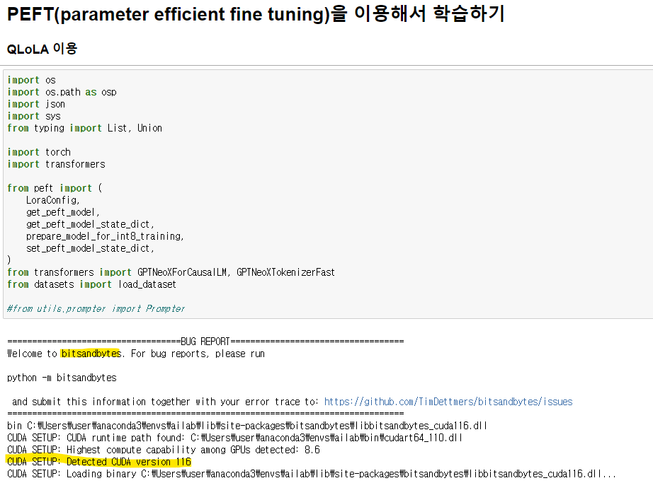 드디어... LLM을 PEFT 방식을 이용해서 훈련시킬려고 하는데, bitsandbytes가 linux만 지원한다는 얘기만 잔뜩 있고 도움이 되는 글들을 못 찾아서 디버깅하는데만 5시간 쏟은 것 같다...