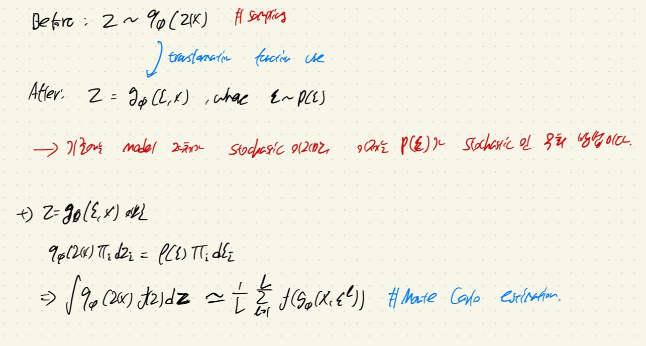 2. Equation 7은 transformation function인 g_φ(ε, x), where ε ~ p(ε)을 이용해서 p(ε)이 stochasitc하고 z는 gradient하도록 변했다.
