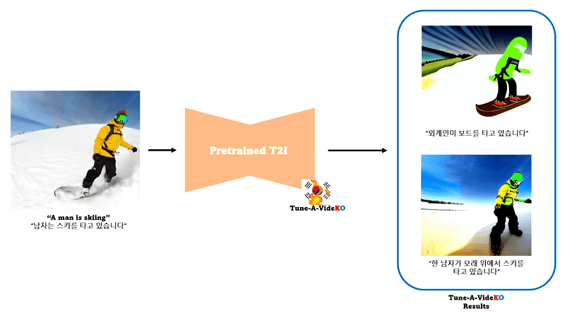 Tune-A-VideKO 모델은 기존에 사전 훈련된 Korean-stable-diffusion을 활용하여 One-shot tuning을 진행한 후, 한국어 text를 넣어서 DDIM으로 video generation을 합니다!