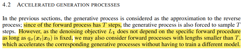 따라서, Forward process가 T steps를 가지고 있다해도, L1까지 가는 sampling 과정에서 더이상 특정한 forward 과정이 고려되지 않기 때문에, 더 적은 steps으로 충분히 generation할 수 있다는 점이 포인트이다!!