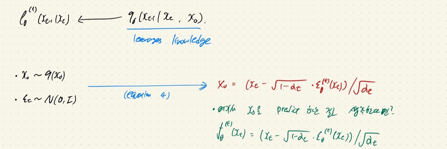 즉, xt-1은 noise한 xt가 있을 때 x0를 이용해서 xt-1을 sampling하는 방식으로 진행된다!