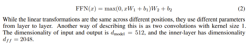 +) Feed forward network는 2개의 linear와 ReLU가 적용된 형태이다.