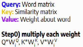 +) 실질적으로 Q, K, V의 input matrix 값은 동일합니다. W를 통해서 서서히 변화를 한다고 보면 됩니다.